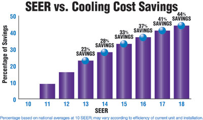Central air conditioners and heat pumps use the Seasonal Energy Efficiency Ratio or SEER as the measurement. The higher the SEER, the greater the efficiency, and the greater your energy savings potential. Keep in mind, the savings is compared to air conditioner usage costs - not your overall electricity bill.